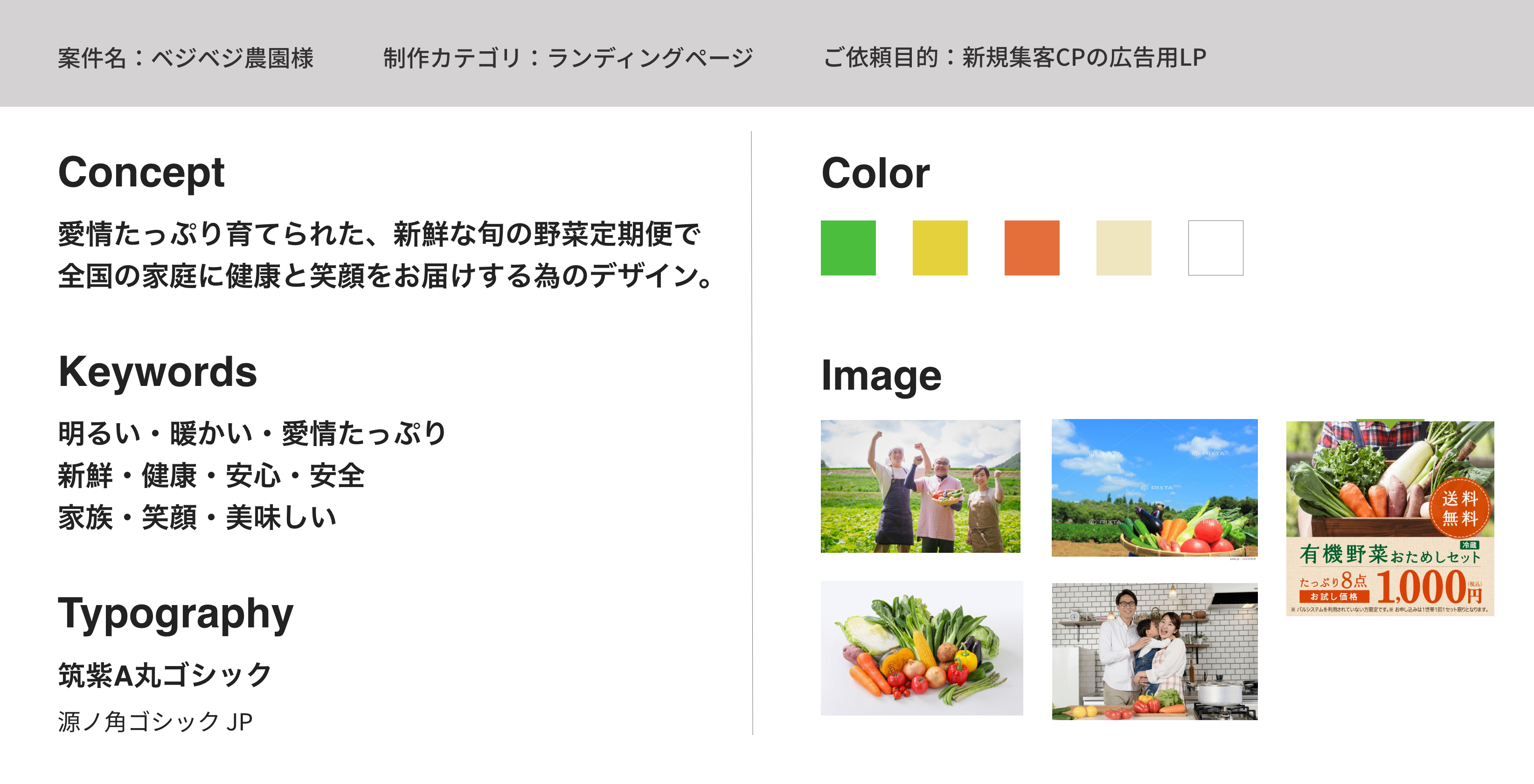 健康志向の20〜40代の男女、および家族連れ。 「手軽に野菜を摂りたい」「新鮮で安心な食材を選びたい」と考える方を中心に、 食への関心が高く、定期便サービスの利用を検討しているユーザーを想定しています。